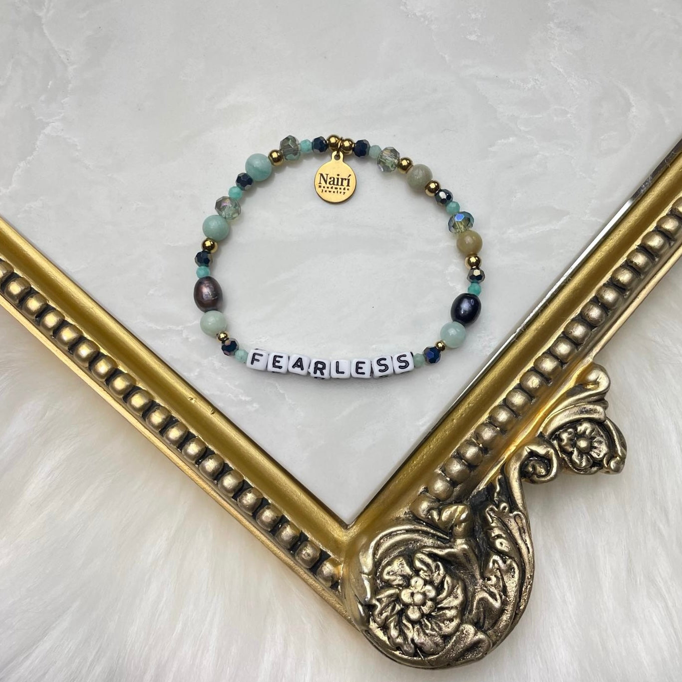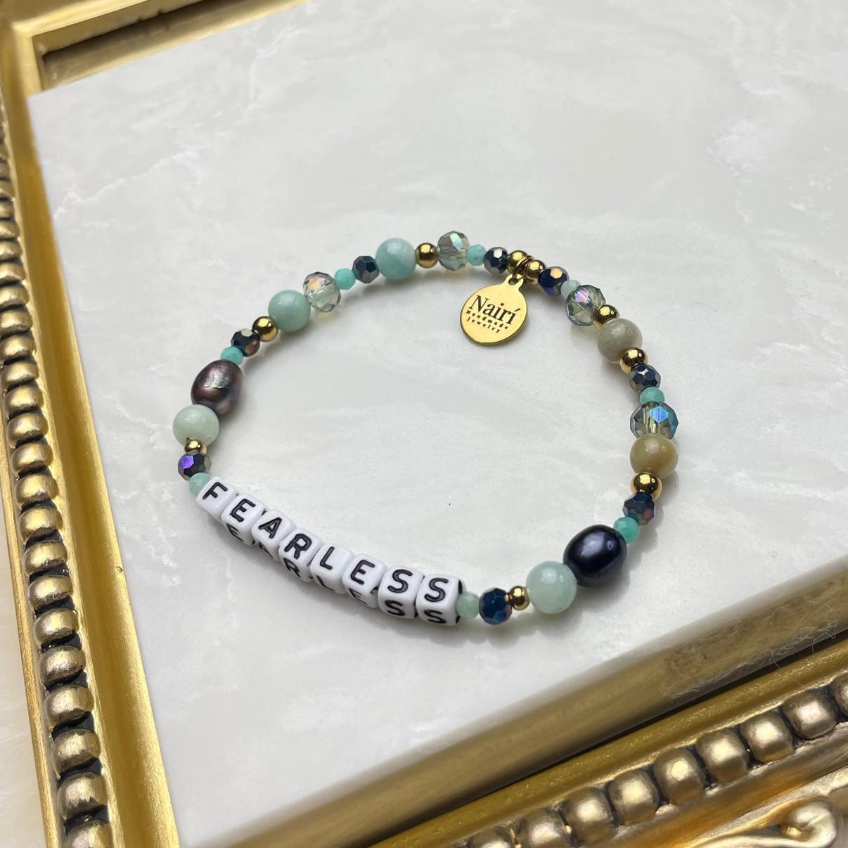 Designed to inspire bold faith and quiet confidence, the Fearless word bracelet is a reminder to walk forward without fear. Crafted with vibrant Shades of green beads, soothing amazonite, luminous freshwater pearls, and striking black pearls, it’s finished with subtle crystal accents for just the right touch of sparkle. Each element comes together to create a piece that feels strong yet graceful — perfect for everyday wear or as a meaningful gift.