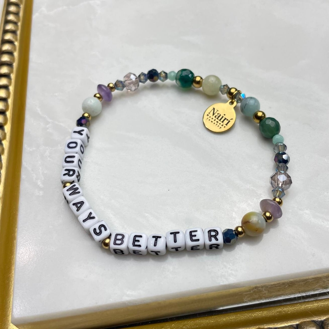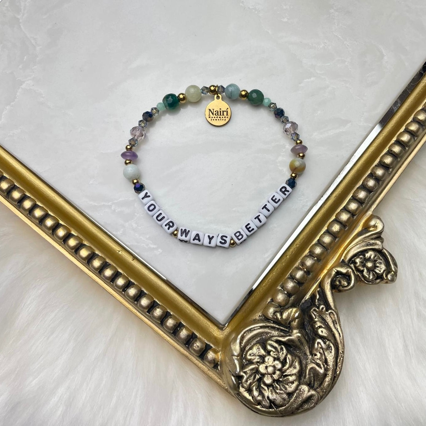 Inspired by Forrest Frank’s “Your Ways Better,” this word bracelet is a daily reminder to trust God’s timing, His plans, and His process — even when the path isn’t clear. Designed with calming shades of green and blue, accented by a hint of purple, it reflects peace, faith, and spiritual growth. Finished with gold-plated stainless steel, this bracelet is made to be both meaningful and durable, perfect for everyday wear.